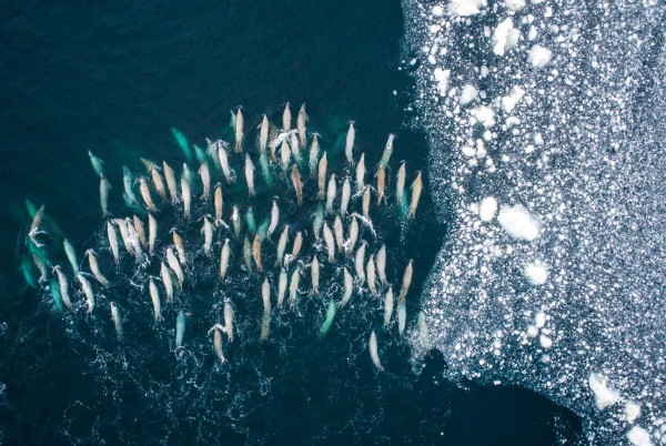 Diese Luftaufnahme zeigt eine Herde von Krabbenfressern (Lobodon carcinophagus) bei der Nahrungssuche. Diese Robbenart ist in südpolaren Gewässern weit verbreitet und ernährt sich überwiegend von Krill, woher auch ihr Name rührt. Meist jagen die Tiere nachts und tauchen dabei in Tiefen von bis zu 430 Metern. Für gewöhnlich finden sie ihre Beute allerdings in geringeren Meerestiefen. Es war faszinierend zu beobachten, wie diese Gruppe von über 100 Krabbenfressern fast synchron auf- und abtauchte, und dabei systematisch die Eiskante nach Nahrung absuchte.