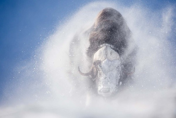 Nach einem heftigen Sturm im norwegischen Hochland sprang dieser Moschusochse plötzlich auf, um den Schnee aus seinem Fell zu schütteln – ein beeindruckendes Schauspiel. An diesem Tag herrschten extreme Wetterbedingungen mit starkem Wind und eisigen Temperaturen. Ich liebe es, in solchen Momenten draußen in der Wildnis zu sein und die Kraft der Elemente zu spüren. Winter, Schnee, Kälte – das sind meine bevorzugten Zutaten, um atmosphärisch starke Bilder zu machen.