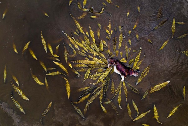 Der Kadaver des Nilpferdes, das wohl eines natürlichen Todes gestorben war, blieb nicht lange erhalten. Schon nach drei Tagen war von dem massigen Körper nichts mehr zu sehen, und auch die zahlreichen Krokodile waren verschwunden. Die Aufnahme entstand am Luangwa, einem Nebenfluss des Sambesi. Der Titel des Bildes beruht auf meinem Versuch, die Krokodile in diesem Bildausschnitt zu zählen. Ich kam zu keinem eindeutigen Ergebnis, aber auf jeden Fall sind es über 100 Individuen.