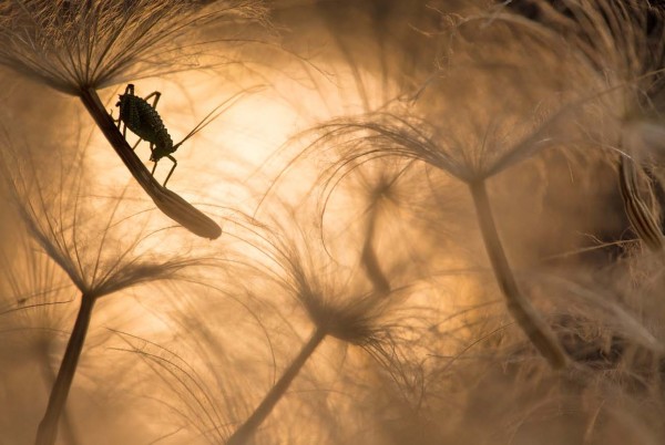 Im letzten Frühjahr entdeckte ich diese kleine Laubheuschrecke zwischen den Samen eines Korbblütlers. Das Tier war nicht allzu schreckhaft, und so konnte ich noch weitere Samen so positionieren, dass ein Eindruck von Schwerelosigkeit entstand. Mit einem Reflektor fing ich das goldene Licht der aufgehenden Sonne ein und lenkte es auf die Szene. Auch wenn sich das Tier geduldig zeigte, musste ich mich beeilen, mein Bild zu machen, bevor es schließlich davonsprang.