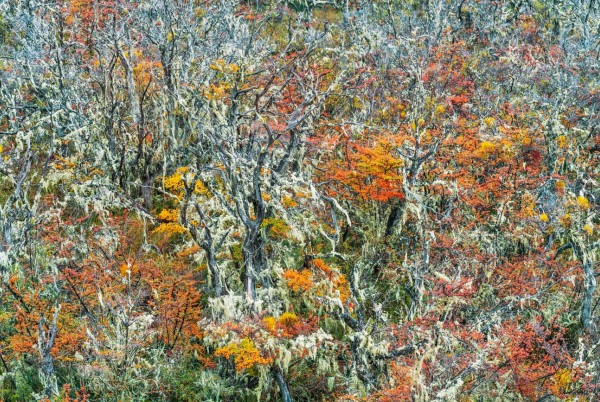 Neben der eindrucksvollen Bergwelt und dem charismatischen Puma gehört dieser Wald zu den Natur-Ikonen Patagoniens: uralte, vom Wind verformte Bäume mit langen Flechtenbärten, geisterhaft und farbenfroh zugleich. Um die chaotisch anmutende Szene malerisch in Szene zu setzen, fotografierte ich von einem erhöhten Standpunkt und versuchte, ein ausgewogenes Verhältnis von Strukturen und Farben zu komponieren. Wieder einmal zeigte sich, dass die Natur wahre Kunst hervorbringt.