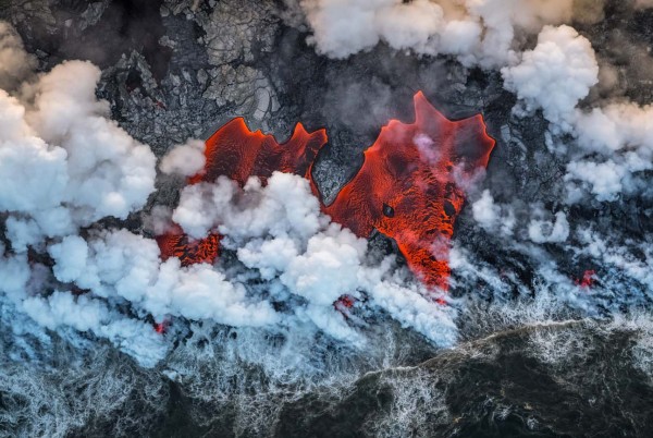 Im Mai 2018 begann die größte Eruption des Kilauea (Hawaii) seit 200 Jahren. Innerhalb weniger Tage bedeckte der Lavastrom eine gewaltige Fläche, und schließlich erreichte er das Meer. Ich hatte mir zum Ziel gesetzt, die Gewalt und das Drama dieses Schöpfungsprozesses im Bild festzuhalten. An der sich stets verändernden Küste tobte eine Schlacht zwischen dem Meer, das um seinen verlorenen Platz kämpfte, und dem Vulkan, der Meter für Meter an Boden gewann. Über der Schlacht stiegen gigantische Wolken aus saurem Dampf auf, gespeist von den gewaltigen Wellen, die der Pazifik gegen die Lava schleuderte.