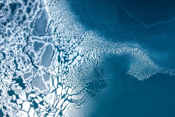 Diese Aufnahme entstand im Winter an der Ostküste Grönlands. Das Meereis dehnte sich bereits weit aus, und aus der Luft offenbarten sich fantastische Muster und Strukturen, die in schönem Kontrast zum Blau des arktischen Meeres standen.
