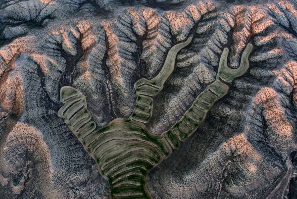 Diese Luftaufnahme zeigt Weizenfelder im Trockenfeldbau in Aragonien, eine der wasserärmsten Regionen Spaniens. Die Felder sind eingebettet in die Hügellandschaft und durch Steinmauern voneinander separiert, um Erosion zu verhindern. Das Getreide wird im Winter, wenn es Niederschläge gibt, ausgesät und zu Beginn der Trockenzeit geerntet. Es handelt sich um eine sehr alte Form des Landbaus, der dieser Region eine ganz besondere Anmutung verliehen hat, was besonders aus der Luft gut zu erkennen ist.