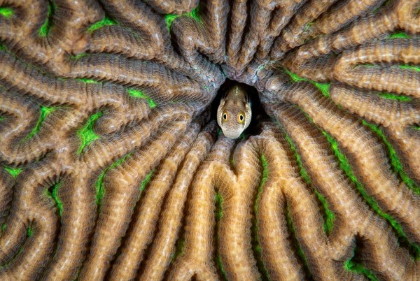Das Bild entstand während meines ersten Tauchgangs in den Korallenriffen vor der Küste Jordaniens. Ich fand eine flache Stelle, an der es von Meereslebewesen nur so wimmelte, und schon nach wenigen Minuten entdeckte ich diesen Blaubauch-Schleimfisch (Alloblennius pictus), der in einer wunderschönen Hirnkoralle lebte. Dieser lustig aussehende Fisch, der nur wenige Zentimeter groß wird, ist im Roten Meer und im Golf von Aden endemisch. Viele Korallenriffe gibt es bereits seit über 10.000 Jahren, und sie haben sich in dieser Zeit vielen Veränderungen angepasst. Doch heute gilt ein Viertel aller Riffe als irreversibel geschädigt, und weitere zwei Drittel sind ernsthaft gefährdet.